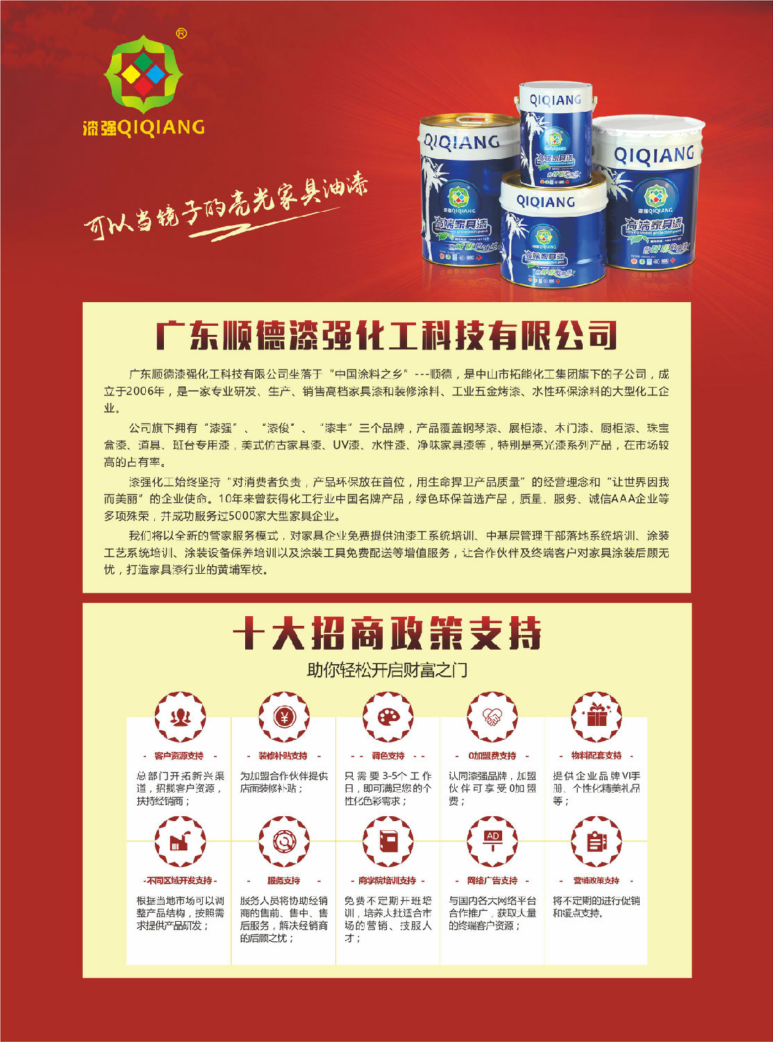 漆強(qiáng)化工立志打造家具漆行業(yè)中的黃埔軍校,不僅提供專業(yè)的培訓(xùn),更提供全方位的管家式貼心服務(wù),讓合作伙伴們無后顧之憂!誠邀您來合作。
